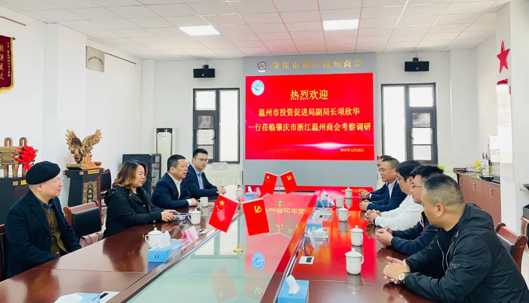 12月28日,温州市投资促进局副局长项欣华 、香港温州同乡会常务副会长胡敏、香港温州工商会副秘书长齐勇一行到我会考察座谈 。肇庆市浙江温州商会会长陈建乐、党支部书记兼执行会长郑康亮、执行会长胡余武、执行会长南荣平等参加了交流座谈。